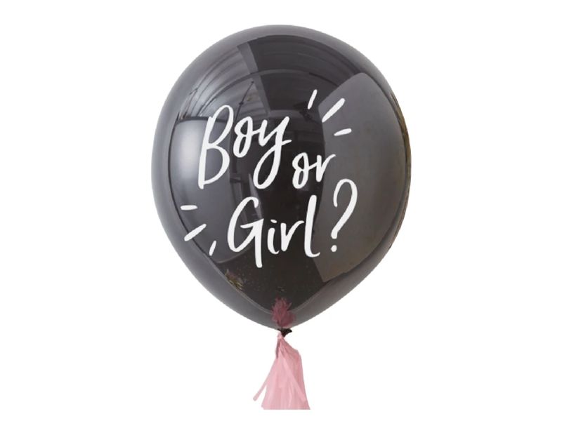Balon lateksowy (gumowy) w kolorze czarnym z białym napisem BOY or GIRL – wersja DZIEWCZYNA. Balon jest wielkości ok. 100 cm. Pojemność balona to 0,4 m3 – tyle trzeba helu, aby balon się ładnie unosił. Oczywiście nic nie stoi na przeszkodzie, aby uzupełnić go powietrzem. Do wewnątrz wkłada się konfetti różowe, aby gości zaskoczyć jaka będzie płeć dziecka.