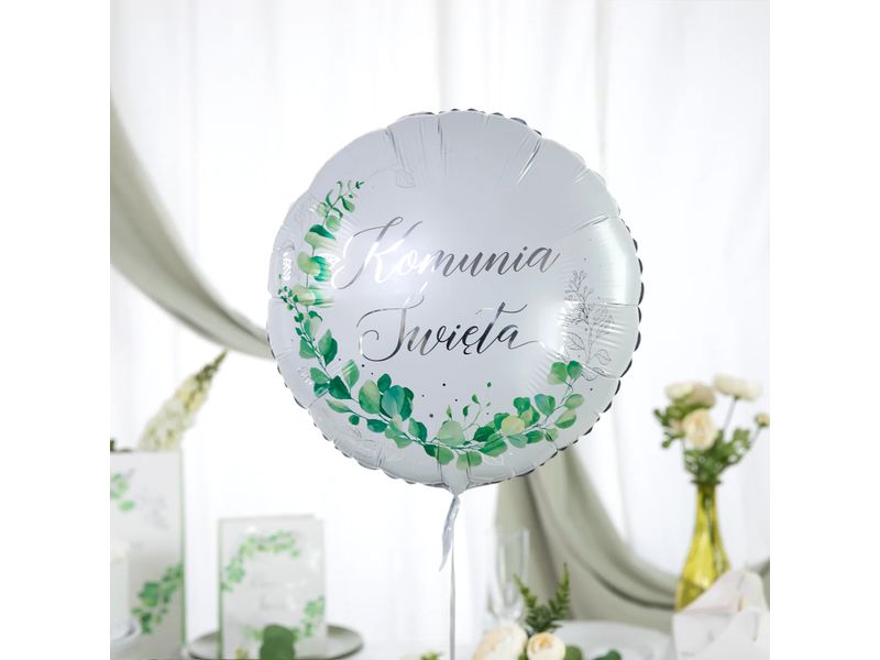 Balon foliowy specjalnie przygotowany na okres sakramentu Komunii Świętej z motywem eukaliptusa z napisem w kolorze srebrnym. Balon jest wielkości ok. 45 cm (18 cali). Idealne na dodatkową dekoracje na przyjęciach komunijnych. Spraw, aby ten dzień był wyjątkowy.