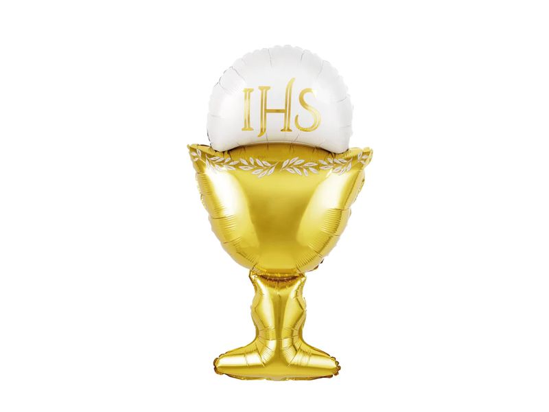 Balon foliowy specjalnie przygotowany na okres sakramentu Komunii Świętej z motywem kielicha z hostią. Balon jest wielkości ok. 45 cm. Idealne na dodatkową dekoracje na przyjęciach komunijnych. Spraw, aby ten dzień był wyjątkowy.