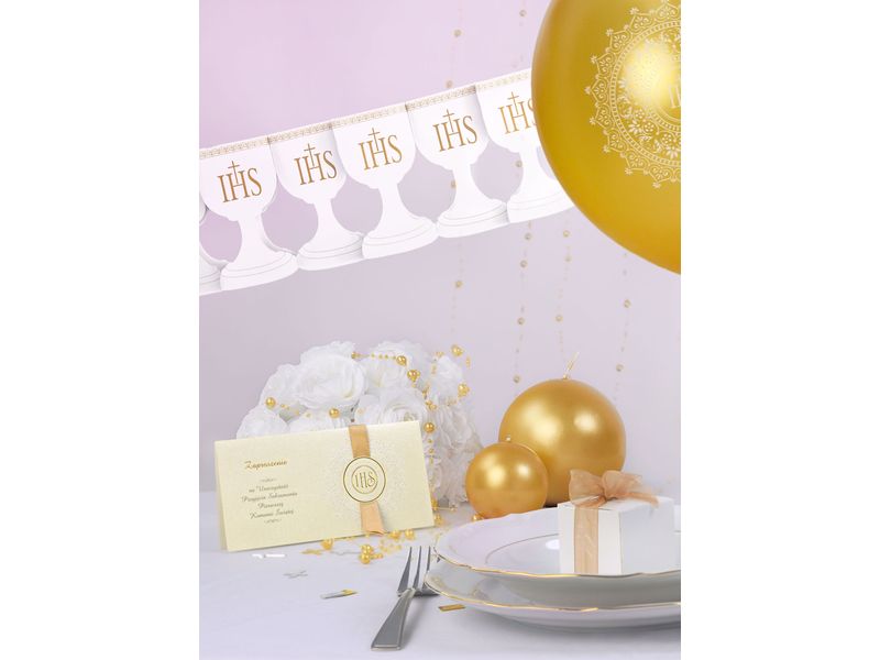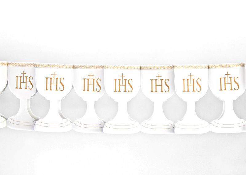 Baner komunijny – Komunia Święta z motywem Kielicha z IHS. Zestaw składa się z flag z pięknym motywem kielichów z nadrukiem IHS.
