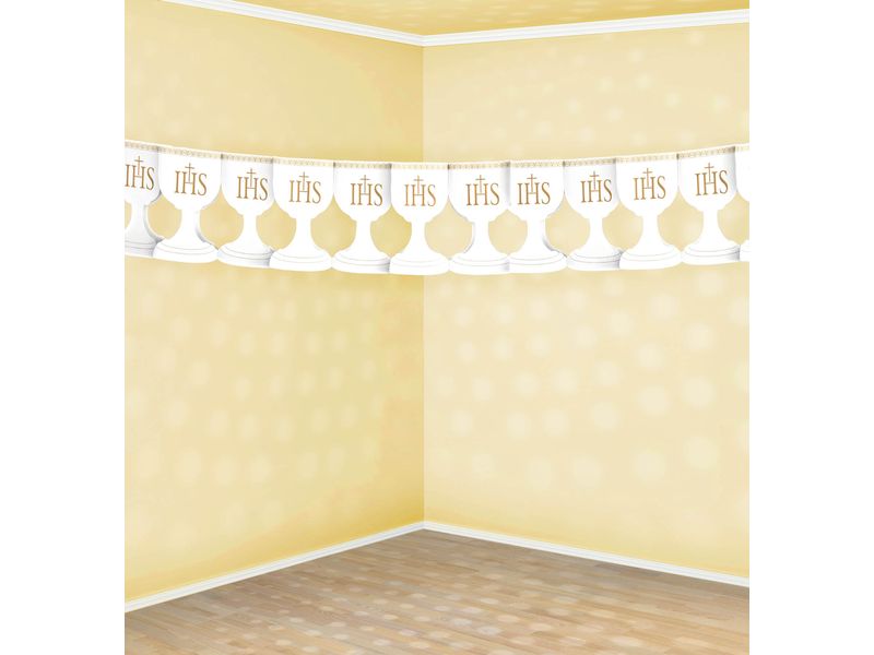 Zobacz jak pięknie wygląda baner komunijny po rozłożeniu go w celu udekorowania sali na uroczystość.
