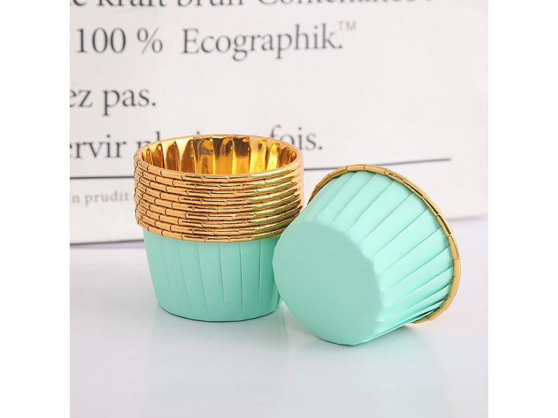 Foremki (Papilotki) do muffinek wykonane z aluminium. Posiadają atesty do kontaktu z żywnością. Są tłuszczoodporne i nadają się do pieczenia. Foremka jest w kolorze miętowo złotym, a w opakowaniu znajduje się aż 50 sztuk. Kolorystyka doda imprezie niesamowitego uroku i zaskoczysz zaproszonych gości.