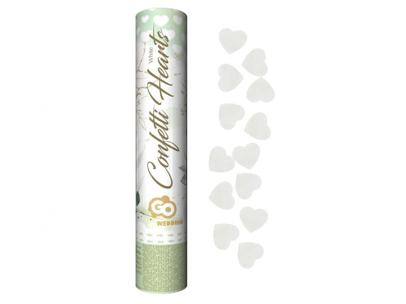 Oferowany model strzela konfetti w kształcie serduszek białe (papierowe), a tuba ma wysokość 30 cm.