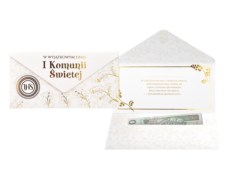 Koperta podarunkowa „Komunia”, KOP-012 – jest eleganckim sposobem na podarowanie bliskiej osobie banknotu lub karty podarunkowej. Koperta jest kolorowa i uszlachetniona metalizowaną folią hot-stamp, jest solidnie wykonana i wyposażona w rzep, co umożliwia jej wielokrotne otwieranie i zamykanie. Koperta zawiera życzenia w środku. Wymiary koperty podarunkowej 20 cm na 10,5 cm po złożeniu.