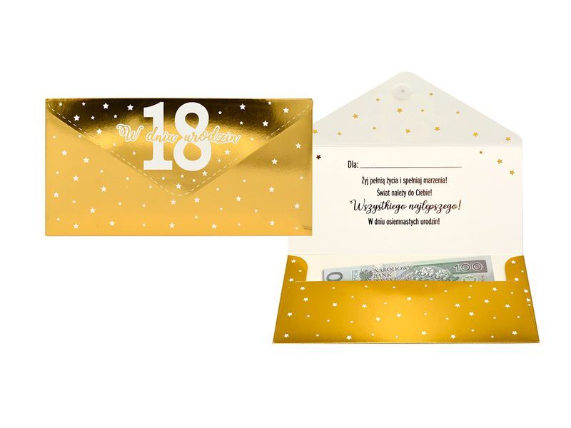 Koperta podarunkowa „Urodziny 18”, KOP-033 – jest eleganckim sposobem na podarowanie bliskiej osobie banknotu lub karty podarunkowej. Koperta jest kolorowa i uszlachetniona metalizowaną folią hot-stamp, jest solidnie wykonana i wyposażona w rzep, co umożliwia jej wielokrotne otwieranie i zamykanie. Koperta zawiera życzenia w środku. Wymiary koperty podarunkowej 20 cm na 10,5 cm po złożeniu.