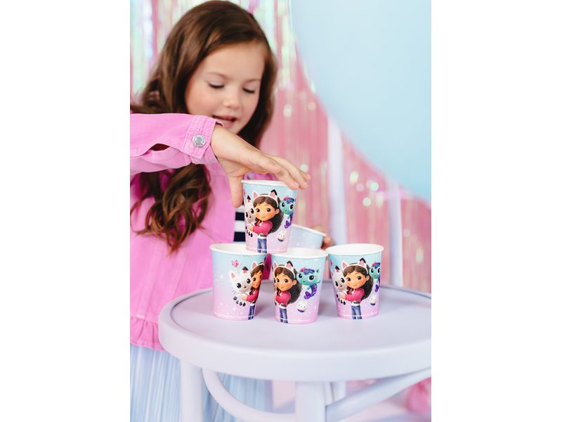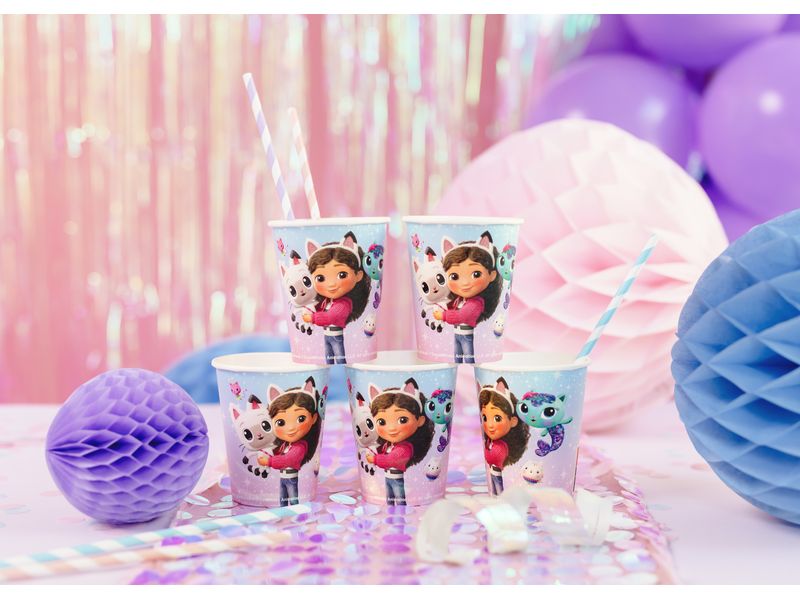 Dopełnij Swoją uroczystość najmniejszym akcentem dekoracyjnym. Kubeczki w motywie Koci Domek Gabi (Gabby’s Dollhouse). Kubeczek jest pojemności 220 ml, a w opakowaniu znajduje się 6 sztuk. Idealnie nadaje się na napoje zimne jak i ciepłe. W Naszych sklepach jak i w sprzedaży internetowej można dopasować pozostałem akcesoria do dekoracji do jednego motywu przewodniego.