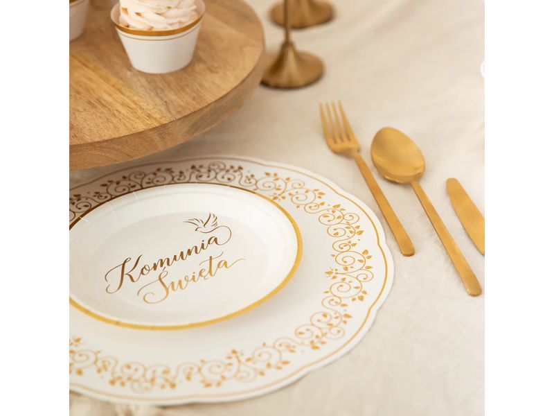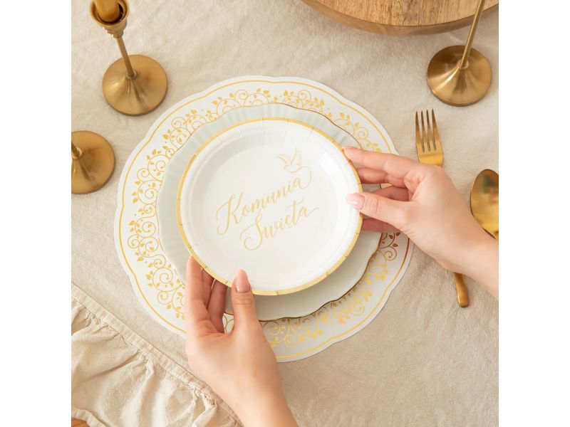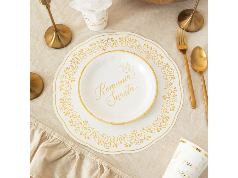 Podkładki pod zastawę dodadzą niesamowitego uroku podczas każdego przyjęcia. Podkładka papierowa ze złotymi roślinnymi zdobieniami ma średnicę 30 cm. Dzięki złotu Twoje przyjęcie może utkwić na wiele tygodni w pamięci zaproszonych gości.