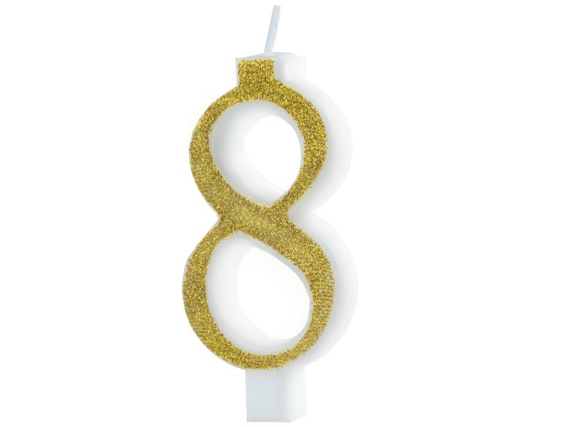 Świeczka jest nierozłącznym elementem każdej uroczystości rodzinnej organizowanej dla dziecka lub innego członka rodziny. Czy ktoś pamięta, aby tort był bez świeczki? Warto zaznaczyć swoje piękne lata piękną brokatową świeczką z cyfrą „8„. Świeczka złota z brokatem posiada wysokość około 9 cm co pozwoli nam zaakcentować to na torcie podczas wykonywania zdjęć. Małą rzecz, a spełni swoje przeznaczenie. Spraw radość bliskiej sobie osobie.