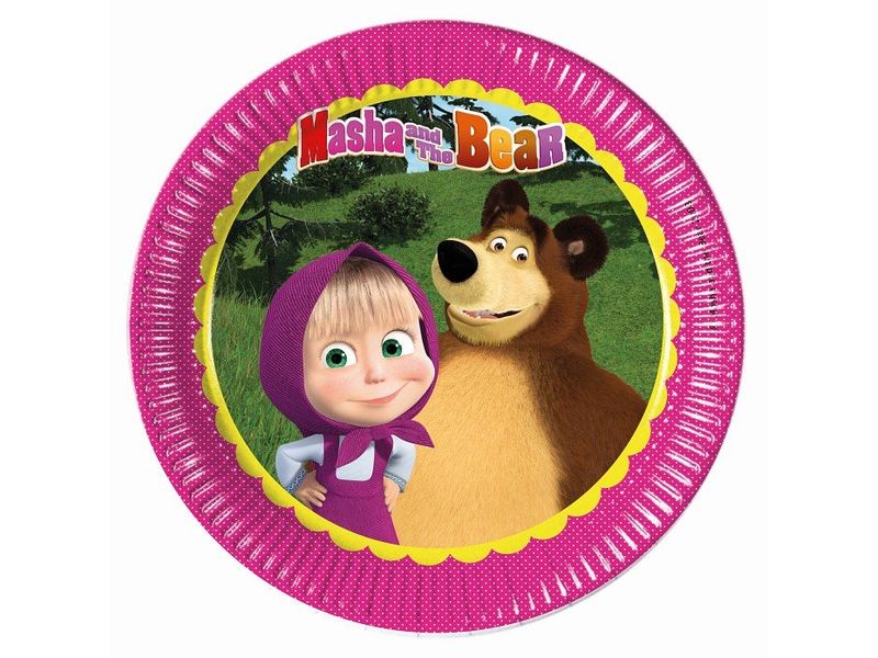 Talerzyki papierowe z motywem Masza i Niedźwiedź. W opakowaniu znajduje się 8 sztuk talerzyków w rozmiarze 23 cm. Idealnie nadają się na przyjęcia w domowym zaciszu, aby dodać akcent elegancji. Dzięki tak pięknym talerzykom możesz uszczęśliwić Swoje dziecko i uatrakcyjnić Swoje przyjęcie.