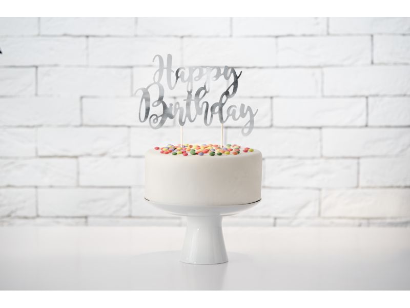 Piękny topper na tort z napisem Happy Birthday w kolorze srebrny. Dekoracja na ciasto jest rozmiaru ok. 22,5 cm. Możliwość wielokrotnej użytku. Spraw, aby dekoracja na tort również obrazowała jaką obchodzicie uroczystość.