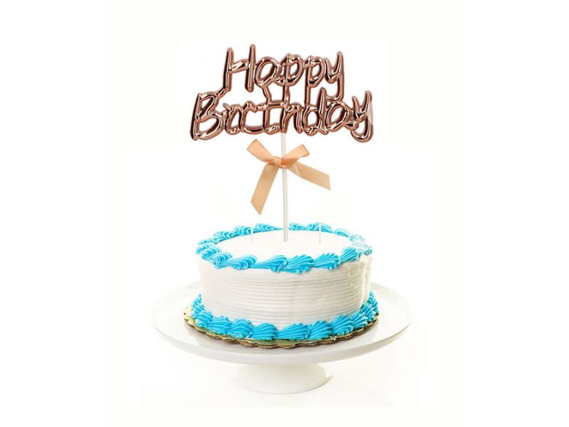 Piękny topper na tort wykonany z plastiku z tekstem „HAPPY BIRTHDAY” w kolorze różowo złotym widocznym na zdjęciu.