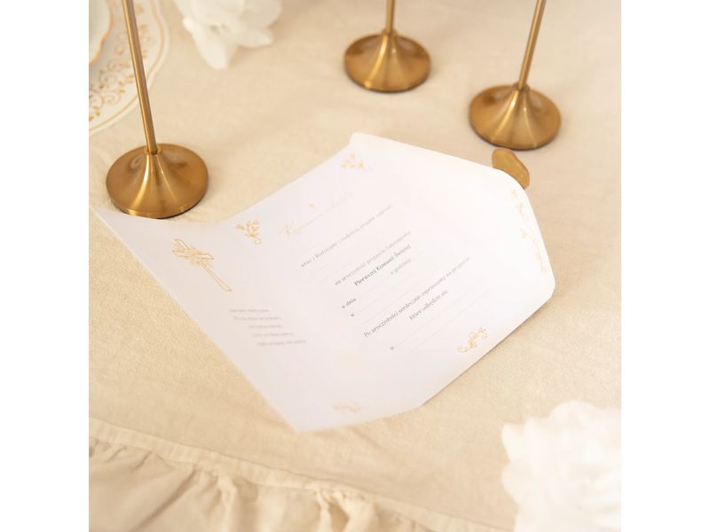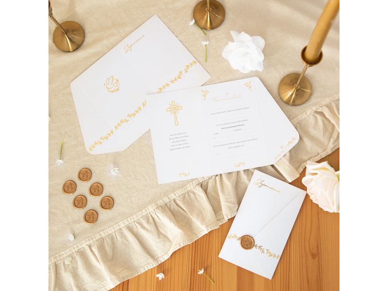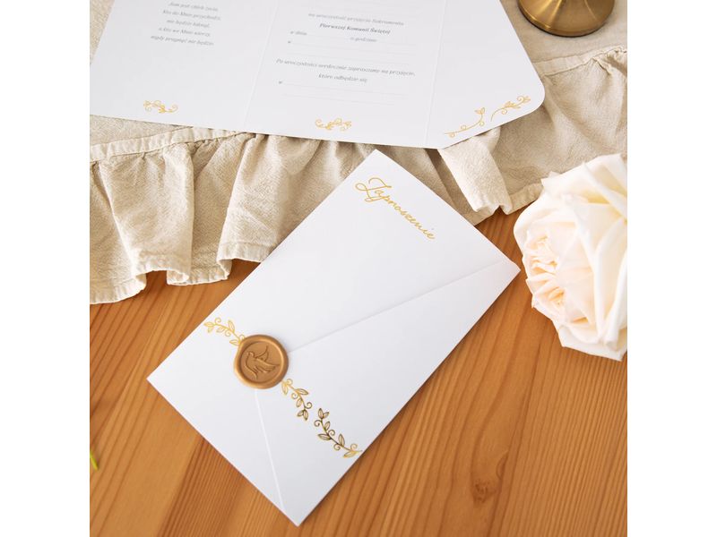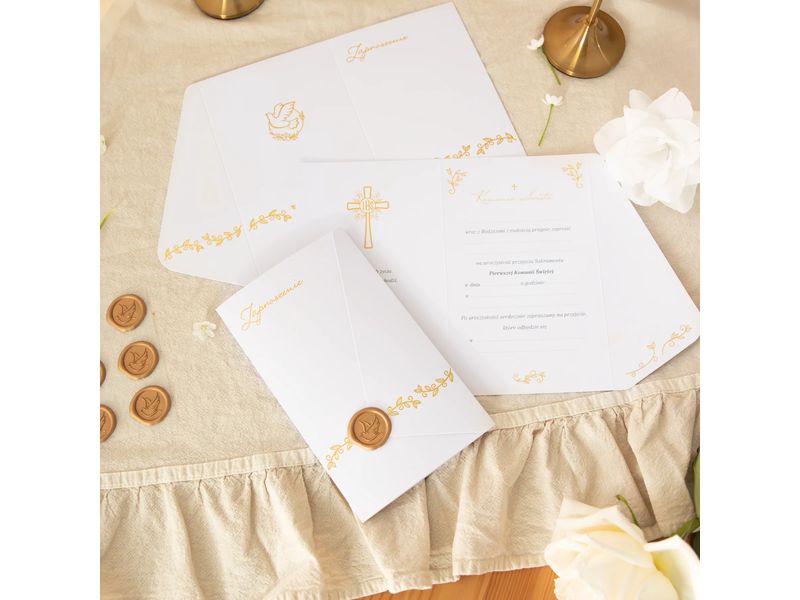 Piękne, tradycyjne zaproszenie na uroczystość Pierwszej Komunii Świętej i przyjęcie w tonacji biało złotej z piękną złotą pieczęcią. Produkt posiada śliczny motyw, który spodoba się każdemu – uniwersalny bez zbędnych udziwnień.