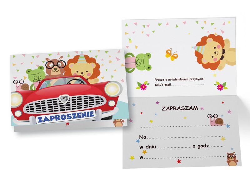 Piękne, tradycyjne zaproszenie na urodziny z motywem dla dziecka „Samochodzik z zwierzakami„. Zestaw zawiera 5 sztuk zaproszeń wraz z kopertami do własnoręcznego uzupełniania danych. Spraw, aby ten wyjątkowy dzień był najlepszym dniem w życiu Twojego dziecka. Każdy najmniejszy szczegół ma znaczenia estetyczne, które zostanie zapamiętane wśród rówieśników.