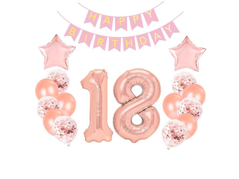 Gotowy zestaw balonów na wykonanie kompozycji na 18 (osiemnaste) urodziny dla dziewczyny. Zestaw 18-stkę, różowe złoto idealnie będzie pasował do wykonywanych zdjęć podczas imprezy urodzinowej lub sesji fotograficznej. Dodaj dekoracji, aby Twoje przyjęcia zostało zapamiętane na długo. Dodatkowo w zestawie znajduje się baner Happy Birthday.